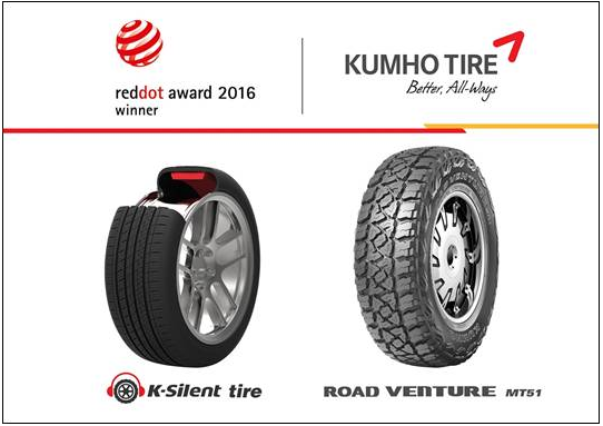 Kumho Tire announced that two of its products have received the 2016 Red Dot Award in the product design category. With this year's win, Kumho has become the first Korean tire-maker to have been honored with the prestigious award for five consecutive years, a feat that proves its competitiveness in tire design.